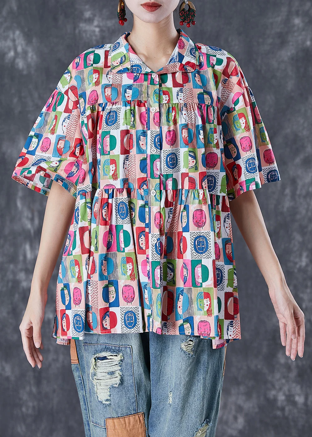 French Graffiti Print Oversized Wrinkled Cotton Blouses Summer Fabric: Cotton Blended Size & Fit: Fit: This garment fits true to size. Length: Size 3XL measures 25.74"from shoulder to hem Bust: Great for any cup size. Waist: Loose Fit. Comfortable room throughout midsection. Hip: Loose Fit - room for hips. Hand Wash Cold.