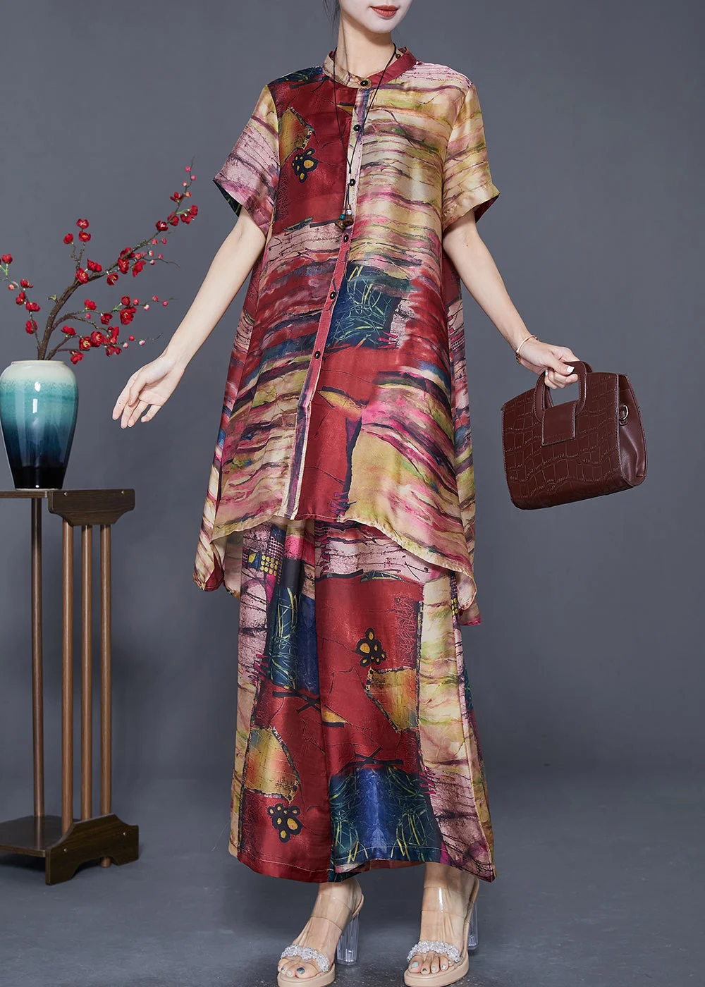 Khaki Tie Dye Silk Two Pieces Set Low High Design Summer Fabric: Silk blended Size & Fit: Fit: This garment fits true to size. Length: Size 2XL measures 31.98"from shoulder to hem Bust: Great for any cup size. Waist: Loose Fit. Comfortable room throughout midsection. Hip: Loose Fit - room for hips. Hand Wash Cold.
