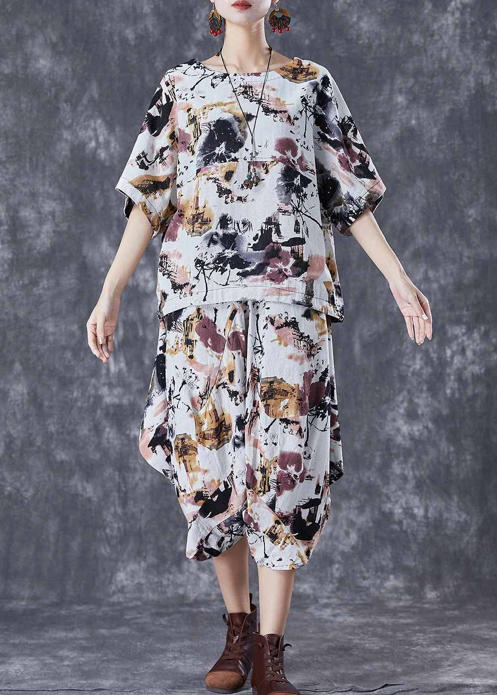 Plus Size White O-Neck Tie Dye Linen Two Pieces Set Summer Fabric: Cotton 45%, Linen 55% Size & Fit: Fit: This garment fits true to size. Length: Size XL measures 23.01"from shoulder to hem Bust: Great for any cup size. Waist: Loose Fit. Comfortable room throughout midsection. Hip: Loose Fit - room for hips. Hand Wash Cold.