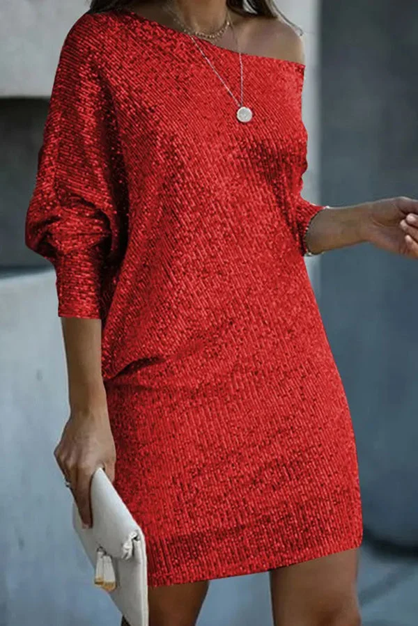 Solid Sequined Off-shoulder Loose Mini Dress